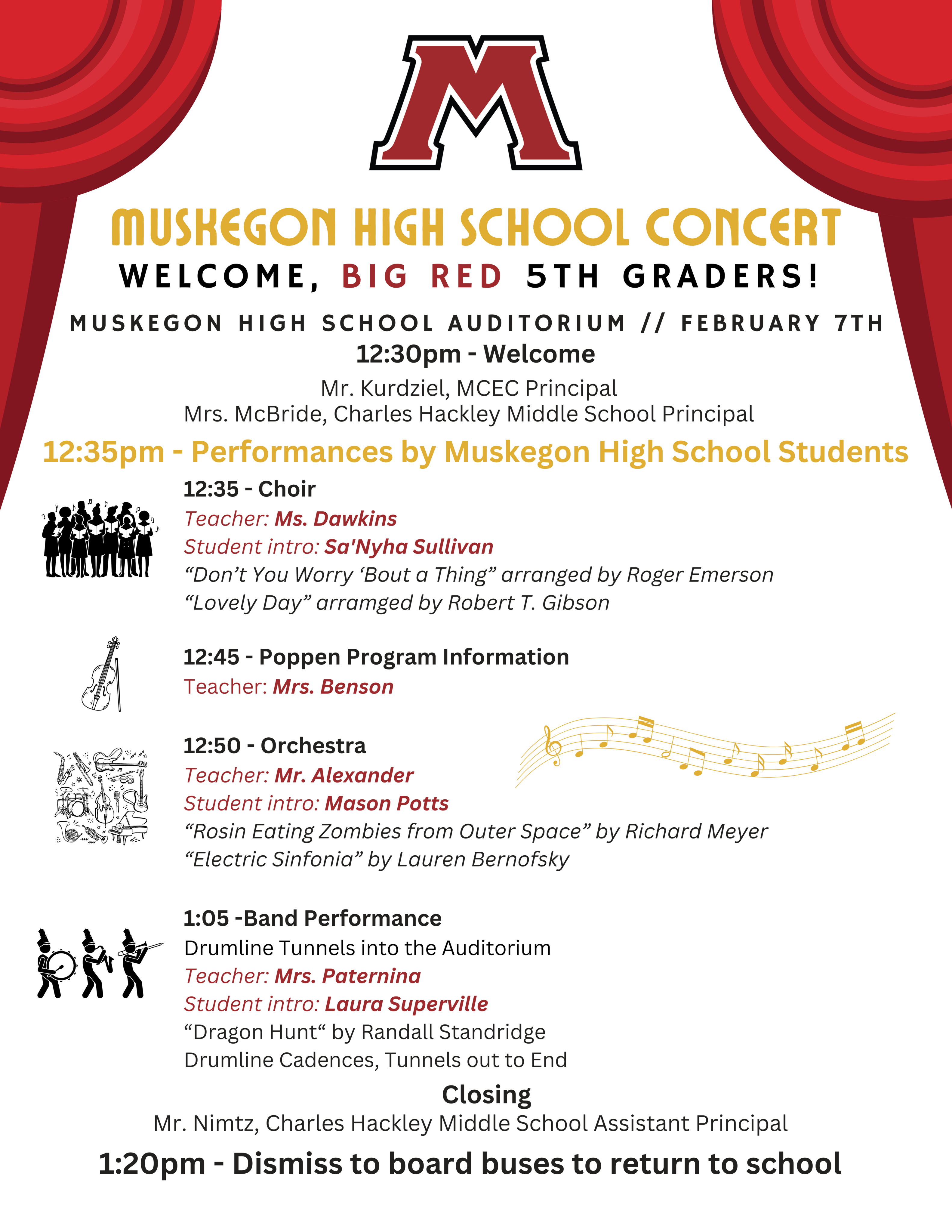 The Big Red Ed Fund paid for bussing so all MPS 5th graders could attend an MHS student concert including Choir, Orchestra and Band. The purpose of this event is to get 5th graders excited about choosing to play an instrument or to join choir as electives for their middle school experience and beyond.