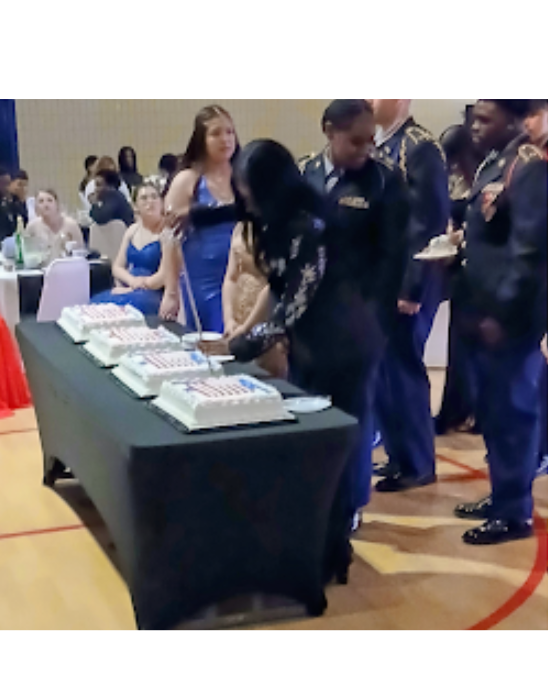 The cake cutting ceremony. This is where the CDT Battalion Commander (Justice Sims for Muskegon) cuts the cake with a saber and passes the piece to the oldest cadet who takes a bit and passes the cake to the youngest cadet symbolizing the passing of leadership from old to young, | Followed by a formal dinner. Cadets were taught dining etiquette in the classroom and were able to put it in practice. | Then there was dancing and having fun. |