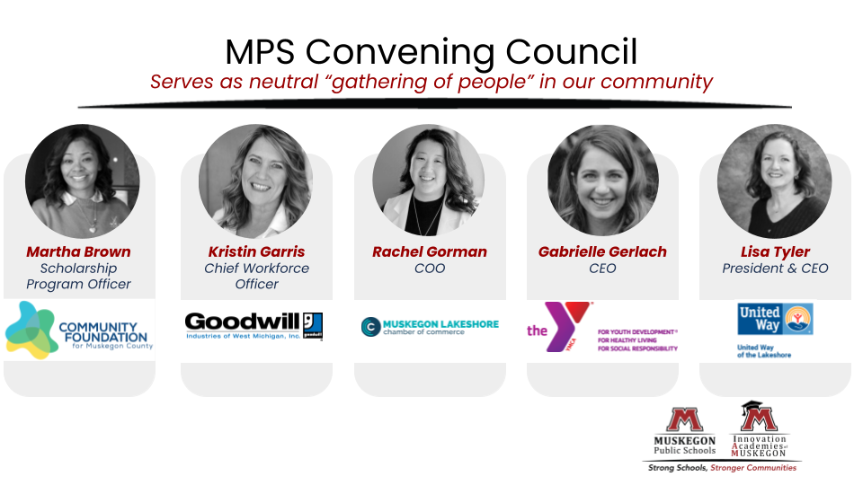 The Convening Council is a steering committee that connects businesses, employers and the community to MPS. This Convening Council will secure career and community-connected resources for MPS students, and will provide insight to the District regarding community and employer talent needs. The Convening Council consists of five non-profit organizations within Muskegon County, with Goodwill Industries of West Michigan, Inc. designated as the Lead Convener. The organizations are: Community Foundation for Muskegon County, Muskegon Lakeshore Chamber of Commerce, The YMCA, United Way of the Lakeshore, with the lead convening organization being Goodwill Industries of West Michigan, Inc.